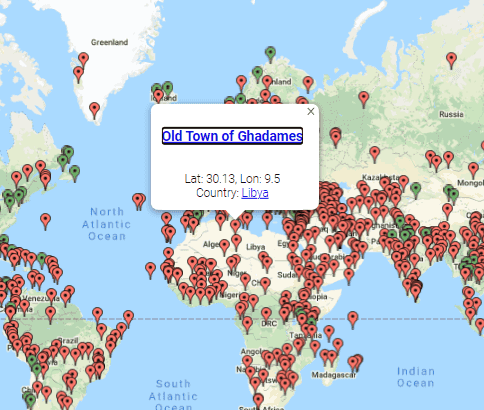 Just go to her website from above link and then in the embedded map, click on any pinned location. It will immediately reveal what it is. You can use the map on this website to explore world heritage sites in any country and then do whatever you want.