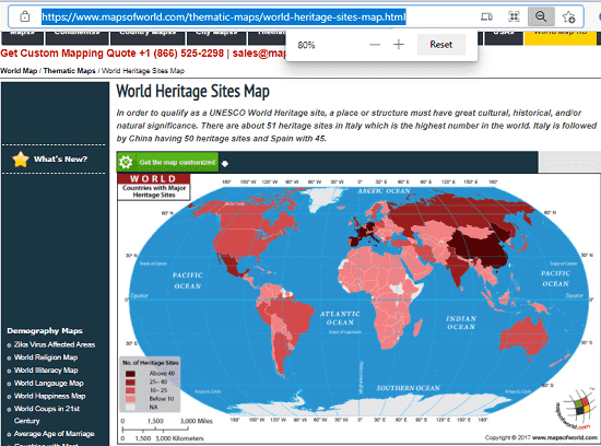 Maps of World is the last free website that you can use to have a very simply map of world heritage sites. Here the map it has is not interactive or with spots already marked. Here it just depict the density of the world heritage sites across various countries. Here you can basically use this website to see statistics about the heritage sites on the globe.