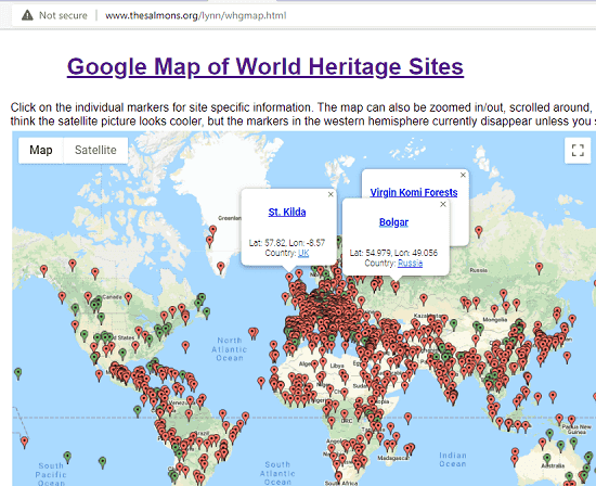 TheSalmons.org seems to be a blog run by someone called Lynn Garry Salmon who appears to be a scientist who researches on historical monuments. On her blog, she has added a custom Google Map pretty much like the one I have mentioned above. here she has covered all the world heritage sites and you can explore them.
