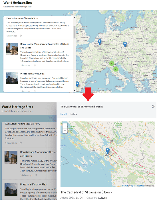 World Heritage Sites Map by Mapspot is another website that you can use to find heritage sites across any country. Here it has grouped the heritage sites and they will expand as you zoom into the map. Additionally, the website offers a search option that you can use to find a specific world heritage site and do whatever you want. Best part is that it includes a photo gallery for each monument or site that you select on the map.