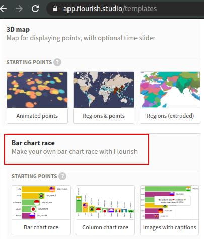 Using Flourish is very easy. You just go to the homepage and then create a free account. Next, from the main dashboard, you create a new project and then choose the chart type. It offers you a lot of types of charts, since in this post we are talking about bar chart race, so just choose that.