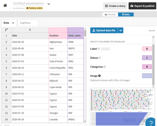 Flourish Studio is one of the best free online bar chart race generator you can use. Here it takes the chart data from your in CSV/TSV/Excel format and then generates the final chart. It lets you host the animated chart that it generates in a unique URL and offers a corresponding embed code. However, in the free plan, you cannot download the chart on your PC. For customizing the bar chart race, it offers you various customization tools and a data editor which behaves lie Google Sheets. You can fully customize the tabular data in order to generate a perfect bar chart race.