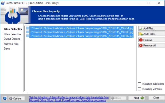 Batch Purifier Lite is another free software to batch remove EXIF data from JPEG images. Its main advantage is that it can remove EXIF data from Zip files without extracting the images. Along with EXIF data, it can also remove other metadata like, XMP data, JPEG comments, Other Hidden Data, etc.