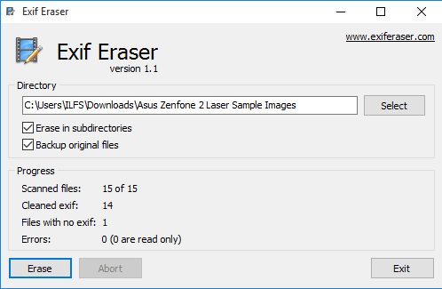 EXIF Eraser is a free lightweight software for Windows to bulk remove EXIF data of images without causing them any damage. Its a simple software with only one goal of removing EXIF data. It easily supports batch removal of EXIF data; all you have to do is select the directory of images from which you want to remove EXIF data. You can also choose to erase EXIF data from images in sub-directories. If you want to keep backup of the original files, then you can choose that also from its interface. After choosing all these options, you now need to click on Erase option and EXIF data of all the images in the selected directory (and sub-directories) is erased. Simple, isn’t it?