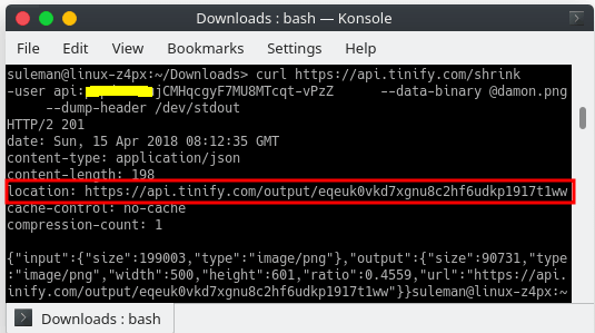 You can see the screenshot of the terminal that I have added. When you run this command to send the POST request, in return the server replies with the JSON response. In the response, you can see the URL of the compressed image and some other parameters. You can copy down the URL of the compressed image and then download it on your PC.