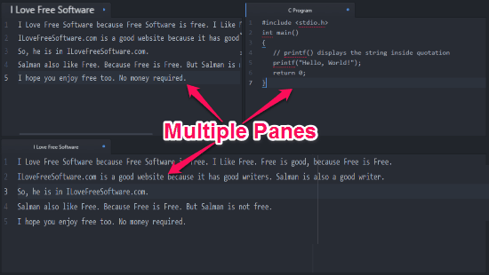Atom is one of the best cross-platform notepad available for Windows, Mac OSX, and Linux. It offers various useful features like built-in package manager, smart auto-completion, file system browser, find & replace, and more. One of the unique features of this notepad is “Multiple Panes”. This feature allows you to split the screen into multiple panes such that you can compare and edit different text files at once. You can either use the same text file on multiple panes or open a different file on each pane. Apart from that, it also lets you open multiple text files in one single pane.