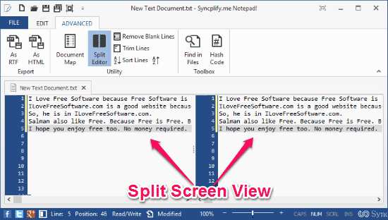 SynWrite is a simple open source notepad that can be used for editing plain text, HTML code, etc. Despite being a simple notepad, it offers some advanced features like syntax highlighting, macro recording, tree view, document mini-map, auto-completion, search/replace, regex based strings extraction, and more. One of the unique features offered by SynWrite is the “Split Screen View”. It can be used to split the screen into multiple parts such that you can edit your files with ease. You can right-click on any of the opened files and then select “Split this tab” option from the list. As soon as you do that, the screen will split into two panes and the new pane will be visible on the right of the notepad.