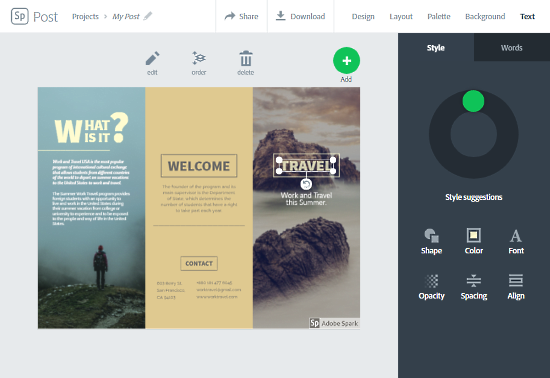 It has some really beautiful text styles which you can customize by changing text color, text size, and font. On top of that, you can add a variety of different effects and shapes to your design. Adobe Spark has all the tools which are necessary for designing a brochure. You can download your design as JPG file and can also generate a shareable link for private sharing.
