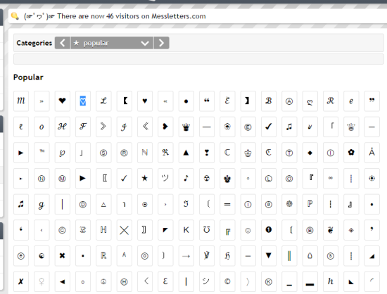 MessLetters is the last website in the list. This website has a wide collection of Twitter symbols spread across categories: Emoticons, Shapes, Symbols, Characters, and Text Art. Just like Twsym, you have to select the the desired symbol and copy it. When you’ve copied the symbol, simply paste it in the tweet wherever you want to use that smiley.
