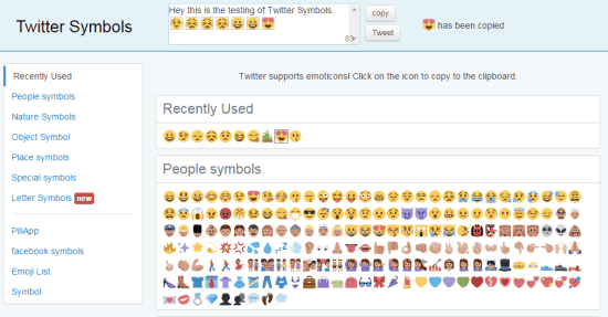 Pilliapp is the first website in the list to get Twitter symbols. The website has 6 categories: People, Nature, Object, Place, Special, and Letter. Pilliapp shows all symbols at the bottom with a text box at top. Clicking on any symbol directly inserts it into the text box where you can type in your tweet. The text box has two options: Copy and Tweet. The Copy option lets you copy the tweet for posting it manually while the Tweet option posts the tweet for you automatically, you only have to authorize Pilliapp for doing so.