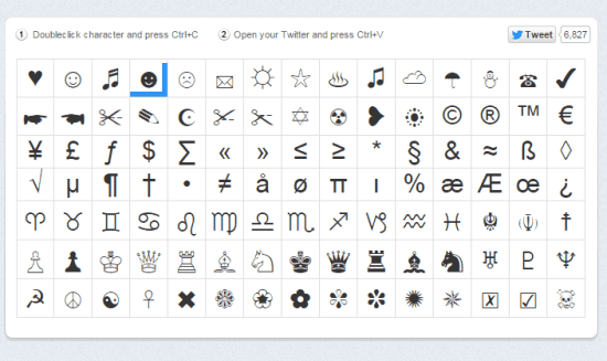Twsym is the fourth website for you to check out Twitter symbols. This website doesn’t have any categories of symbols and all the available ones are shown in form of a grid. This website also don’t let you tweet automatically. You have to compose tweet on Twitter and choose symbol from Twsym. To select, you have to double click on the desired symbol followed by Ctrl+C. The selected symbol is highlighted with a Blue colored boundary.