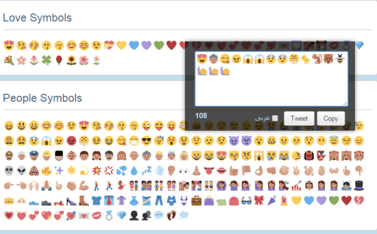 Here is a list of 5 free websites to get Twitter symbols. All of these websites are free to use and let you choose from a wide category of symbols that you can post on Twitter. You can choose from symbols like people, object, nature, place, special, etc. All the websites support copying the symbols, which can be pasted by you in your tweet. Some of them also let you compose the tweet from the website itself, add smileys and emoticons with one click, and then copy-paste the whole tweet.