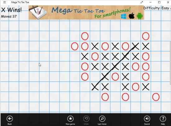 Mega Tic Tac Toe is a free game app where instead of 3 in a row you have to play to make 5 in a row to win. You need to get 5 x’s or o’s in a row to win the game. When you start the game you will get the option to select whether you want to play with one player or two players. You will also get option to view leaderboards and settings. Choose your playing mode. In one player mode you will also have to choose the difficulty level you want to play with easy, medium, hard, expert, and master. You also have to choose what you want to play with x or o. Click the play button and the game will be started. You will see an interface like the one shown in the above screenshot. Start placing x’s and o’s on the board and try to make a row with 5 in them to win. The settings option of this game lets you turn the sound of the app on or off and also let’s you change the language of the app.