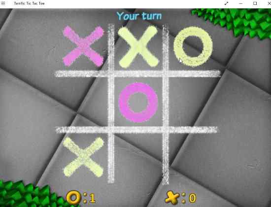 Terrific Tic Tac Toe is a free Windows 10 game app. When the app starts you will get two options to play in single player mode or two player mode. In single player mode you will also have to choose between a difficulty level from easy, medium, or hard. Once you choose the game will start and a screen like the above screenshot will come up. Now you can start placing your x’s and o’s. The first player to get 3 in a row wins. The settings option will let you turn the music and sound of the app on or off. Apart from this you can also change the theme of the app from settings. You get three theme options sidewalk chalk, Christmas crosses, and doodle.