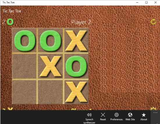 Tic Tac Toe is a free game app for Windows 10. The game when launched takes you directly to this page shown in the screenshot above. By default the game will start in single player mode where you play against the computer. But you can change that through the preferences option given at the bottom toolbar of the app. From preferences you can choose the difficulty mode from easy, medium, and difficult. You can also choose the two player mode from here. You can also choose from various themes from the preferences. Apart from themes you can also choose the speed of the game from slow, fast, and fastest. The sound and speech synthesizer option can also be turned on or off from here.