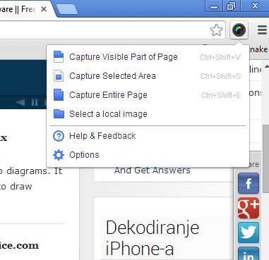 Again you get three types of screenshots, visible content, custom selection of the page or full page screenshots. They will become available depending on what kind of website you have open.