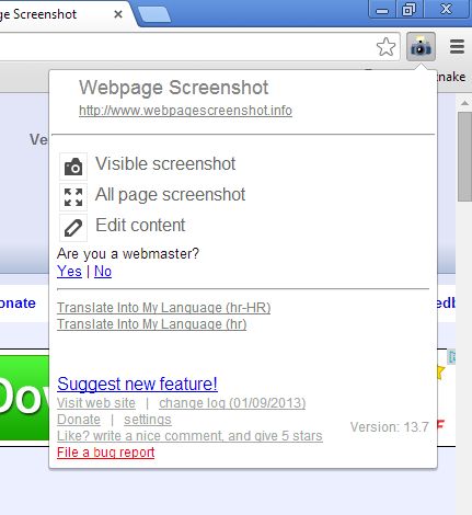 Webpage Screenshot works similarly to the previously mentioned screenshot extension for Google Chrome. The same three types of screenshot can be created with one very important difference.