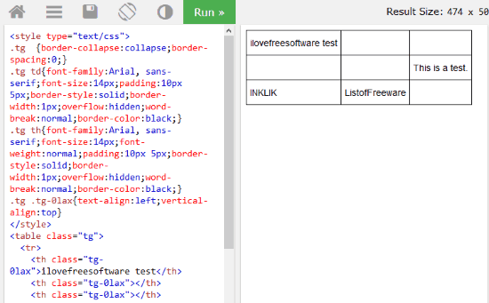 Its HTML editor interface has two parts. The left part is used to add and edit HTML table and the right part shows output preview. So, you can paste HTML table data, edit it on the left part, and use Run button to check the preview. If the output is good, copy the new HTML table data.