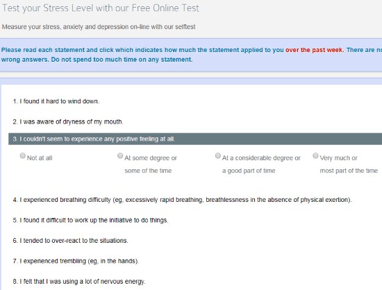 Test Your Stress Level from 15Minutes4Me is an online test to measure your stress level. For this, it asks you 23 questions, which are basically statements. You have to answer the questions if they applied to you over the past week. There are 4 options which you can select based on how much the statement applied to you.