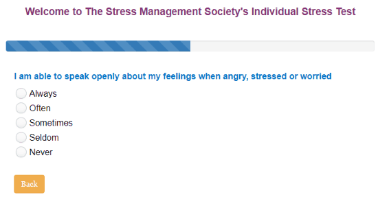 Test Your Stress is another good stress test from Be Mindful with 10 questions. You do not need to register to take the test. You need to answer the questions based on last month. There are 5 options for you to answer the questions. When you complete the test, you get a score on a scale of 40. If you want, you can take the Be Mindful course to reduce stress levels.