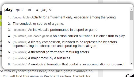 Dictionary Lookup works completely different from all the word meaning extensions that I covered until now. It doesn’t let you select words from text, but rather calls up an overlay search box for you to look for meaning of a word using Wiktionary.