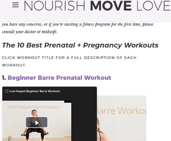 Nourish Move Love has a nice set of workout videos which are designed for pregnancy. You can check them out from the link given. The title of all the videos is clickable. Click the video title to find out a detailed description of the video along with photos and the video itself. Some videos that you will find on this website are beginner barre prenatal workout, cardio prenatal workout, 10 minute body weight workout, prenatal yoga flow, etc.