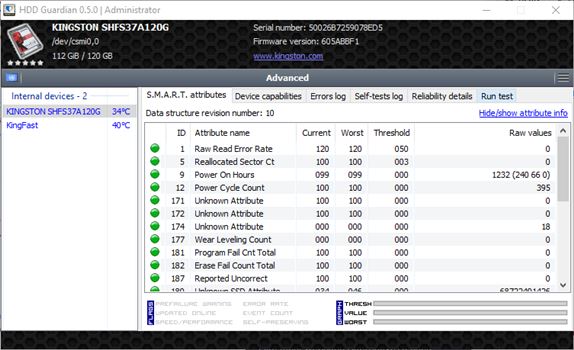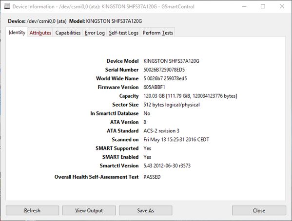 After clicking on the selected hard drive you’re going to be presented with a quick report and health overview (see image above). More detailed overview of the SMART attributes and the hard drive capabilities, error logs, tests for determining the hard drive status are also available. Each one of the aforementioned components is hidden away behind a tab up top. SMART values are assessed with “normal”, “old age” and “pre-fail” to give you some idea what the numbers you see mean. Make sure to Google and additionally research the values you detect because I received warnings in GSmart that I didn’t in CrystalDiskInfo.