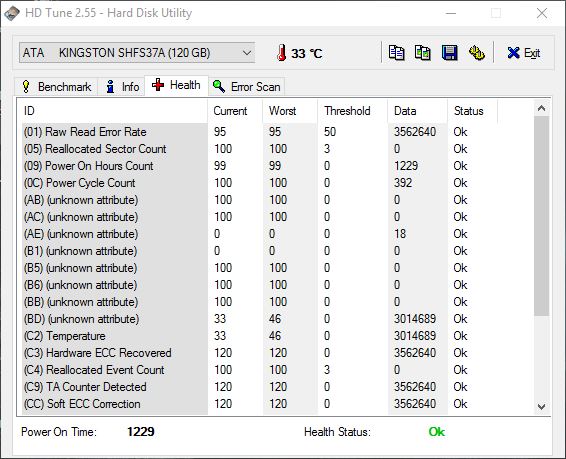 Those with multiple drives can switch between them using the drop down menu in the top left corner. Various reports and tools that application has to offer can be accessed by selecting the appropriate tab down below. Health wise the application gives you a temp readout, overview of the SMART values and an overall estimate of the health. Most of the SMART values were reported as OK for my SSD. Like I already said, take them with a grain of salt. If some of them are in “pre-fail” state, look up what they mean and what they should be online before taking any actions.