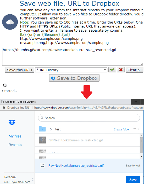 URL2Drop is an open source tool to upload files to Dropbox using a URL. Just like the above tool, you can use it to upload a single or multiple files using their URLs. It lets you specify up to 100 URLs and then upload them all directly to your Dropbox account. There is no sign up required to upload files. Just put all the URLs in the box and then hit the “Save” button. You can specify a particular folder in your Dropbox and it will upload them for you. And being an open source tool, there is an advantage that if the online tool goes down you can use its source to host it on your own server(DigitalOcean for example).