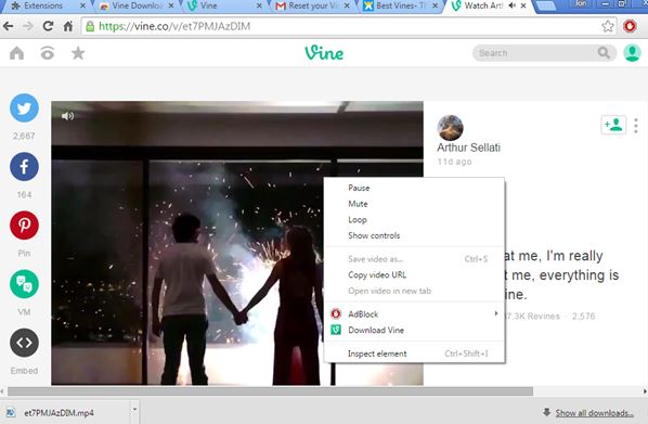 Another thing that makes it interesting is the fact that it integrates better into Vine/Instagram. You can see what I mean by that on the image above. Instead of hiding behind the right click context menu, Vigram option for downloading Vines is added to the left sidebar, where social sharing buttons on the Vine page are located. Just left click on that icon and Vine video is downloaded right away, without using any kind of third party websites.
