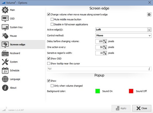 What you see on the image above is me activating the screen edge volume control, which turns on a mouse hover activated edge of screen volume bar that can be controlled by moving the mouse cursor up and down the bar. System tray icon controls, on-screen display (widget), keyboard shortcuts, and even scheduling of volume levels is available.