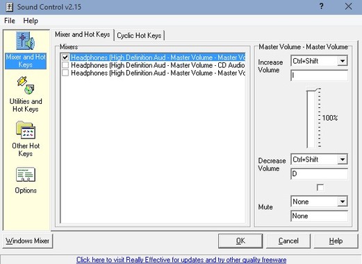 Within the control panel of Sound Control it’s possible to manage currently active audio devices, setup hotkeys for controlling volume up, volume down, mute and you also get audio player playback controls (Winamp and CD Player are only supported). Lots of options for tweaking are available and there’s also a system tray icon for easy access to the alternative sound mixer offered by this volume control software.