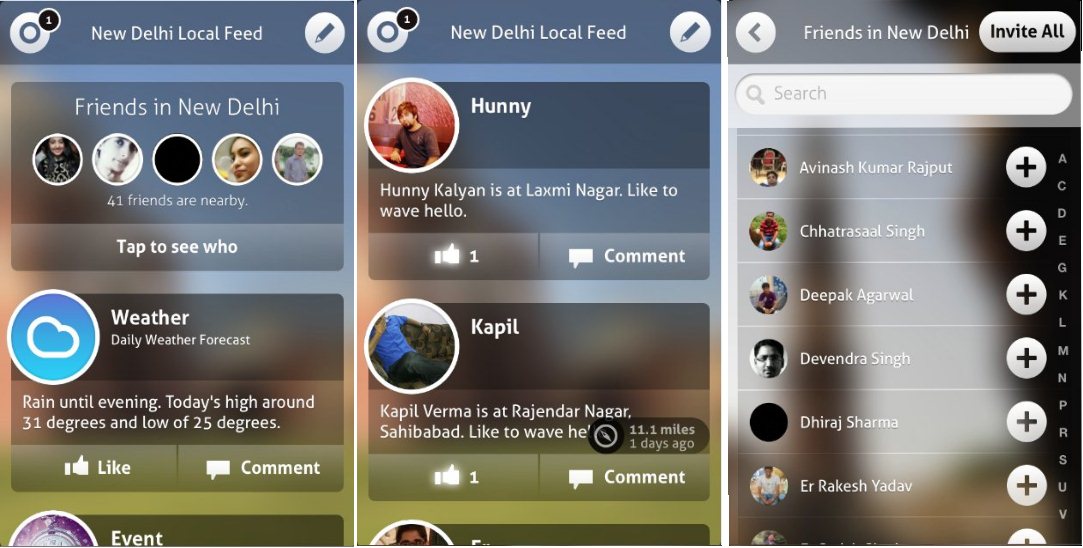 The UI of the app is also very nice and interactive. As you start up with this app, it starts checking your location and starts taking feeds from your locality. It checks how many of your friends from Facebook or Twitter are nearby you in your city. Circle checks how many of them are using Circle, and shows you their status updates. You can also invite other friends from your city to circle.