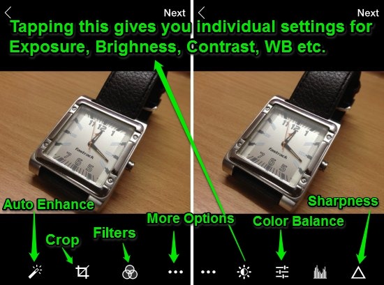 The reasons for this being a massive update for Flickr’s smartphone app (s) aren’t over yet. You can now easily adjust almost every aspect of your photos (Brightness, Contrast, White Balance etc.) with the built-in editing tools. All you have to do is click a photo via the In-App camera and it’s instantly ready for editing. There’s quite a collection of editing tools (conveniently accessed by their respective icons at the bottom) and each one lets you precisely refine every aspect of your photo(s). Check out the following combo screenshot: