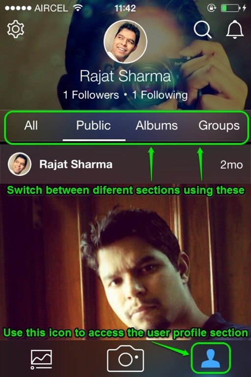 SECTION 2: The second major section, accessed via the bottom right icon lets you access your own photos, albums and view your own photostream in an equally visually stunning interface. This section is divided into four subsections, as mentioned below: