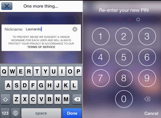 Before posting your first whisper, the app will ask you to choose an username and a PIN for protecting your whispers and chats. Both the username and PIN are not required to login to the app. The username is required for posting your whispers while PIN is required for viewing the chats and whispers.