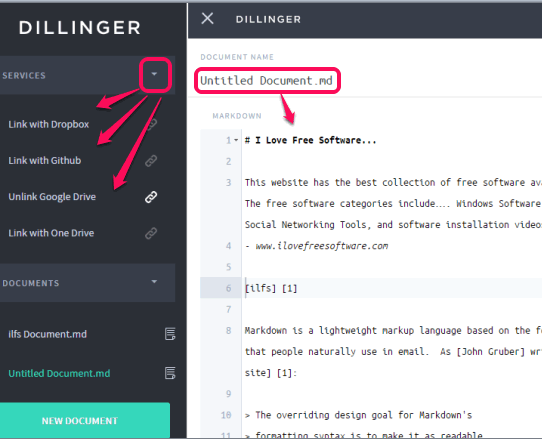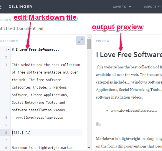 Dillinger is a free online Markdown editor. You can create a new Markdown file or edit the content of your Markdown (a text formatting syntax) file on its interface. Live preview of the output (HTML) is visible on the right side, which makes it interesting to use.