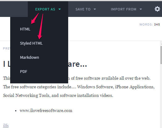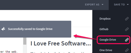 Now you can start editing your Markdown file. On right side, you will be able to view the live preview of changes. After editing your file, you can use EXPORT AS drop down menu to save the file as HTML file, PDF, Markdown, or Style HTML.