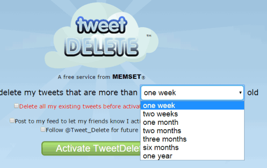 TweetDelete is a free service for Twitter to automatically remove tweets that are older than a month, six months, one week, two weeks, one year, etc. It provides preset options to monitor your Twitter timeline and delete tweets based on the option selected by you. It monitors your Twitter timeline once in a day to delete old tweets.