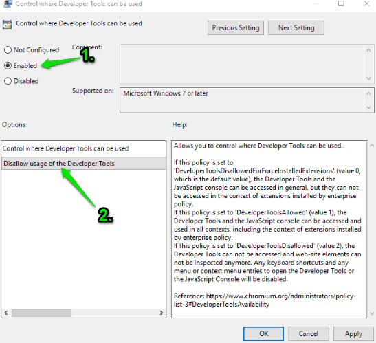Step 2: When the new window is opened, use that Enabled option in that window, and select “Disallow usage of Developer tools” option from the available drop down menu.