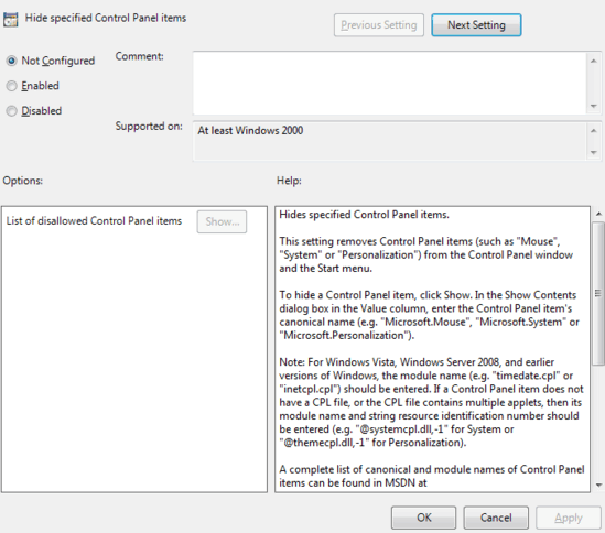 Step 3: Check for a small button that says “Show” besides the text “List of disallowable Control Panel items.” (It is on the left, under a box with the heading “Options”).