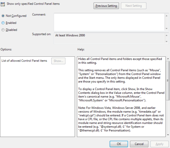 Step 3: Check for a small button that says “Show” besides the text “List of allowable Control Panel items.” (It is on the left, under a box with the heading “Options”).