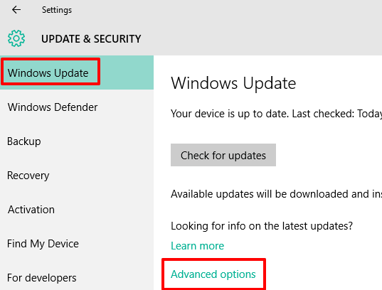 Step 2: Now click on “Advanced options” available in Windows Update section.