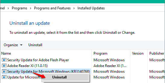 Step 5: It will open Installed Updates window, which shows the list of all updates. You can right-click or double-click on any update to check if you can uninstall it or not. If Uninstall option is visible, use that option and uninstall the selected update.