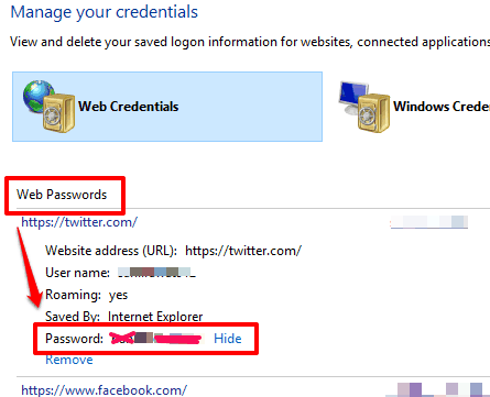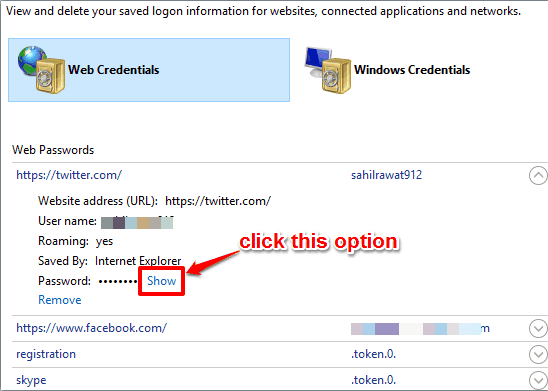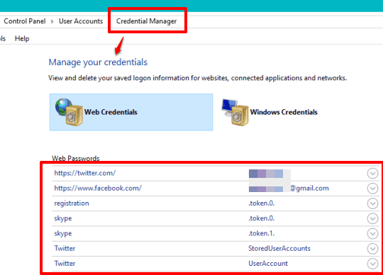Step 2: After opening Credential Manager window, you will see Web Credentials option. Clicking on that option will show the list of websites for which you have saved the passwords.