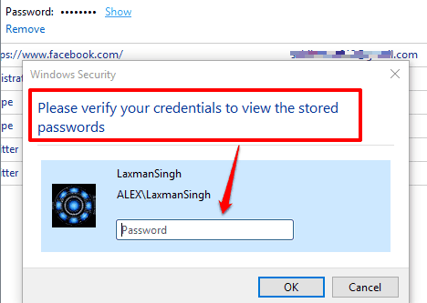 Clicking on that option will open Windows Security window. Using that window, you need to enter the password of your PC, as a confirmation action. After entering the PC password, it will immediately show you the original password of that particular website.