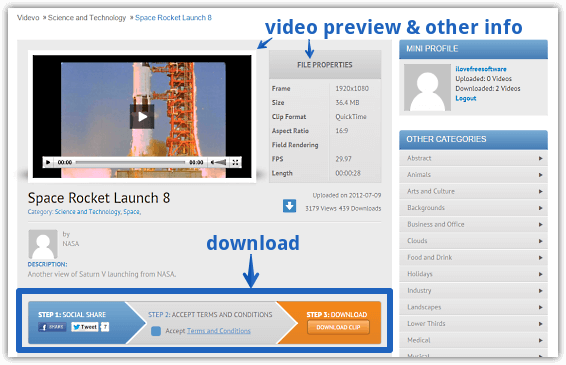 Step 2: To download a video, simply click on it, and you’ll be directed to a page having detailed information (e.g. Frame size, Aspect ratio) and description about it. All you have to do now (as part of the three stage download process) is share the video over social networks, accept the terms and conditions, and hit the Download Clip button.