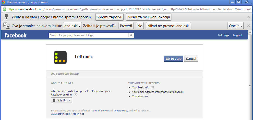Window that pops up for you when you start Leftronic for the first time can be seen on the first image from above. Find a statistic service that you’re interested in tracking, we’ve selected Facebook, and then give Leftronic access to your account, this is what we are doing on the second image. If your company has a Facebook fan page, and you’re interested to see what kind of popularity it has, you can do that with the help of Leftronic.