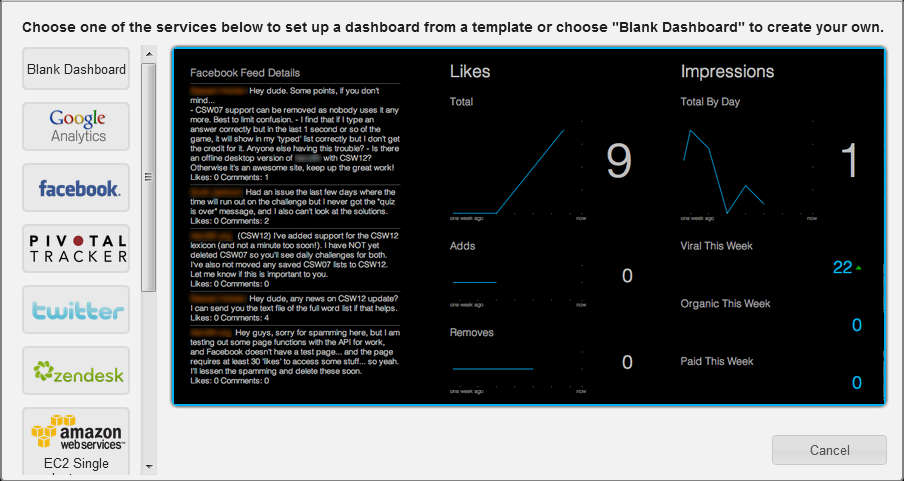 These are just some of the online website usage statistics from where Leftronic can gather information and display them for you, all in one place. With the free account you can add only one of these services, Facebook for example, because you are limited to only one dashboard, to combine more services, you’re gonna have to move on up to one of the paid accounts.