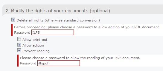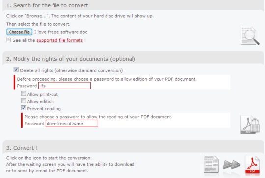 Step 2: This step is optional but very crucial if you need to configure your pdf document to make it readable, printable, and editable. You need to add a password to do so. But at the time of testing this step, it didn’t show any results for me, neither it converts uploaded document into pdf. I tried it with image, doc, and text file, but didn’t get the result. So you can try it on your own or can simply ignore it.